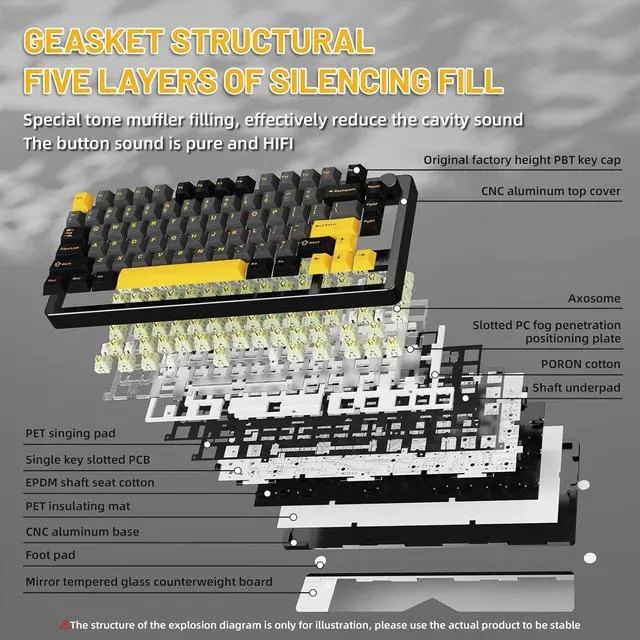 • Gasket Structure & Ultimate Feel and SoundThis aluminum mechanical keyboard is designed with Gasket structure, with axis positioning plate and PCB single key slot, providing soft and elastic hand feeling, every strike is full of comfort. 5 layers of fully padded design, effectively eliminating the cavity sound, bringing pure HIFI-level key