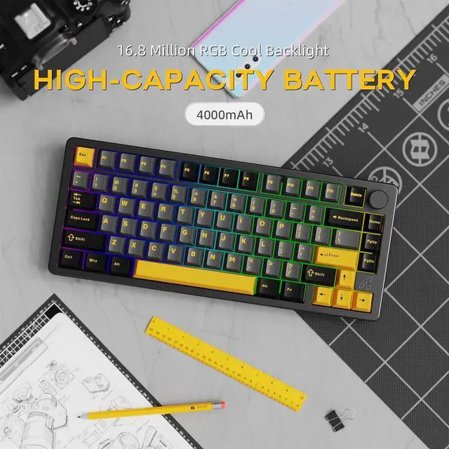 South-facing RGB Backlight & Professional Software ProgrammableThis wireless mechanical keyboard equipped with 16 million colors of RGB backlighting effects and supports 18 dynamic lighting modes, including light effects that move with the rhythm of music, creating an immersive visual experience. With professional driver software, users can customize the lighting effects, key functions and macro settings according to their personal preferences to meet the needs of multiple scenarios such as gaming and office.Whether it's a cool gaming atmosphere or a productive work environment, this aluminum keyboard offers you personalized lighting and feature configurations.