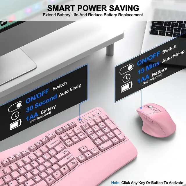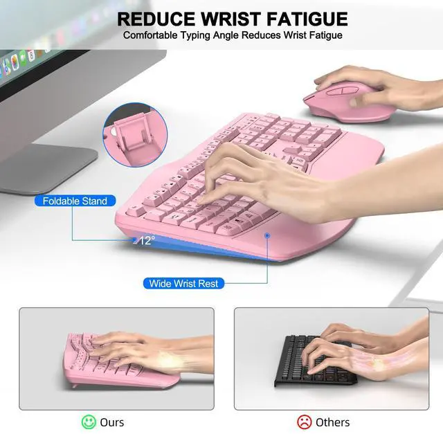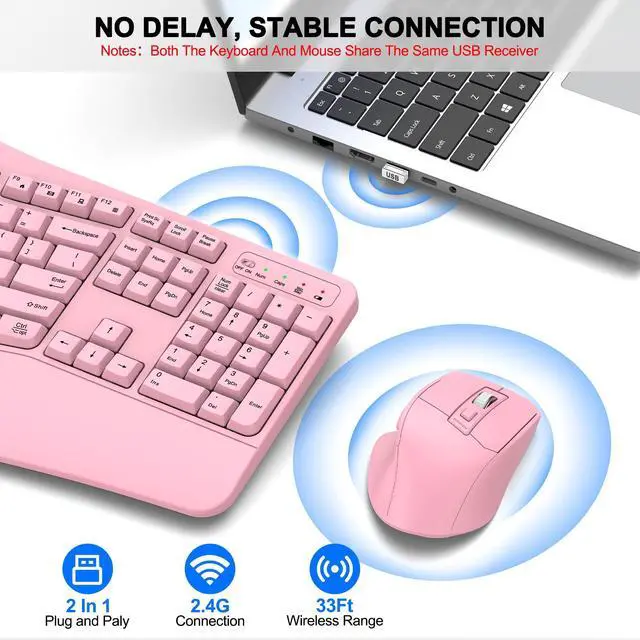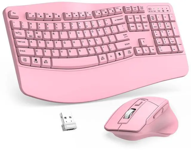 Wave Ergonomic Wireless Keyboard and Mouse ComboThe wireless keyboard features a wave key and wrist rest design that naturally fits your fingers and relieves wrist strain. The adjustable stand allows you to set the keyboard to the most comfortable height, making it ideal for long-term use. Note: The USB receiver is located on the back of the mouse.