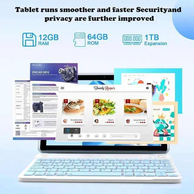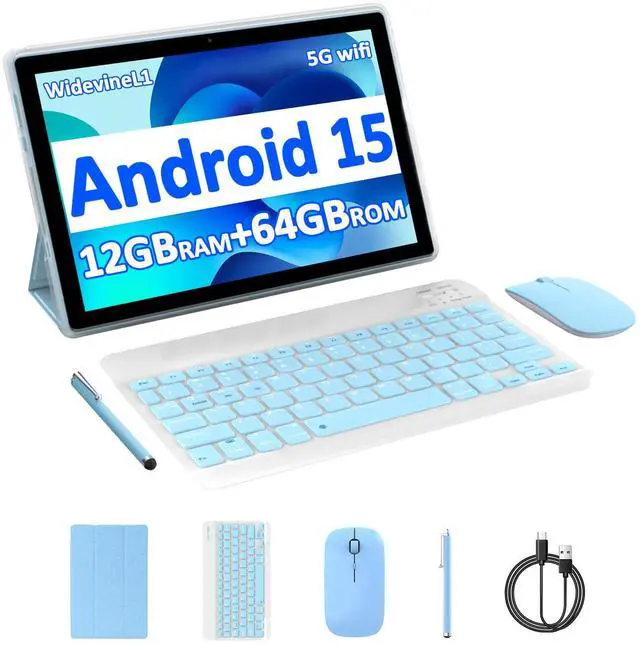 2025 Android 15 Tablet, 10.1 Inch 12GB (4GB fixed memory+ 8GB virtual memory) RAM+ 64GB ROM+1TB Expandable Tablet, 1.8Ghz Quad-core Processor Tablet, 2 in 1 Tablets with Keyboard/ Mouse/ Case/ Stylus/ Type-c Cable, 1280x800 IPS HD Touch Screen Tablet PC, 2MP+8MP Dual Cameras, 6000mAh Battery/ GPS/ 2.4G+5G Wi-Fi 6 / Bluetooth 5.0.