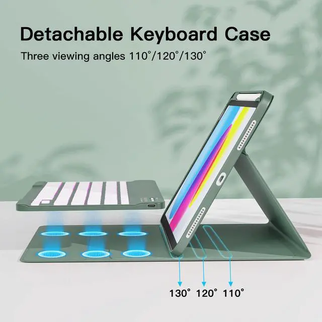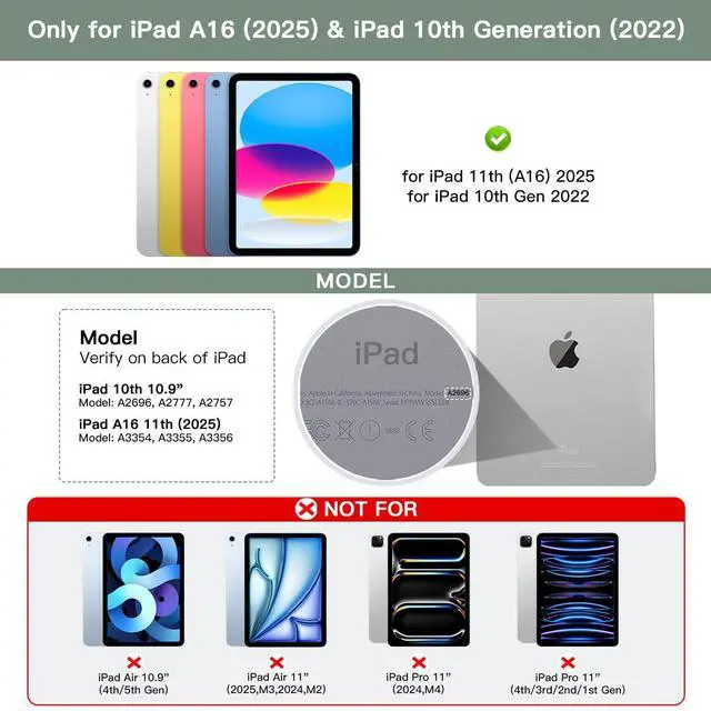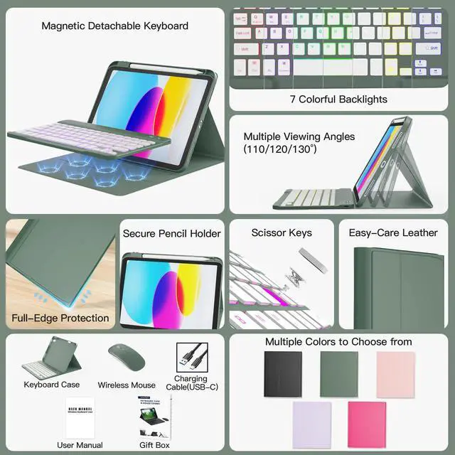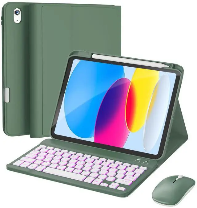 Compatibility: Only compatible with iPad 11th Gen (A16) 2025 (Model: A3354/A3355/A3356) and iPad 10th Gen 10.9-inch 2022 (Model: A2696/A2757/A2777) . NOTE: Please check the "Axxxx" logo on the rear of the tablet before ordering.Tablet & stylus not included. Magnetic Keyboard & Wireless Mouse: The magnetic keyboard detaches easily for flexible use as a standalone tablet case or typing setup. Includes a wireless mouse for effortless navigation and cursor control, maximizing convenience. The mouse and keyboard only supports wireless connection. 7-Color Backlit Keyboard: Type comfortably in any lighting condition! The backlit keyboard features 7 vibrant colors and 3 adjustable brightness levels, allowing you to work or play in stylewhether in dim environments or at night. Perfect for productivity and aesthetics. Multiple Viewing Angles: This keyboard case for iPad 10th generation features 3 adjustable grooves for effortless viewing angle, providing a stable and secure stand for your tablet. Instantly transform your iPad into a laptop-style setupideal for typing, studying, working, drawing or watching movies. Built-in Pencil Holder: The built-in pencil slot securely stores your stylus (Note: Pencil not included). The smart back cutout allows instant removal and easy access, ensuring no interference during typing. Never misplace your stylus. 3 Levels Adjustable DPI: This wireless mouse offers 3 adjustable DPI settings (800-1200-16
