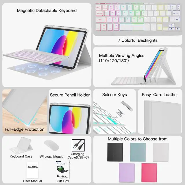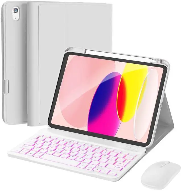 Compatibility: Only compatible with iPad 11th Gen (A16) 2025 (Model: A3354/A3355/A3356) and iPad 10th Gen 10.9-inch 2022 (Model: A2696/A2757/A2777) . NOTE: Please check the "Axxxx" logo on the rear of the tablet before ordering.Tablet & stylus not included. Magnetic Keyboard & Wireless Mouse: The magnetic keyboard detaches easily for flexible use as a standalone tablet case or typing setup. Includes a wireless mouse for effortless navigation and cursor control, maximizing convenience. The mouse and keyboard only supports wireless connection. 7-Color Backlit Keyboard: Type comfortably in any lighting condition! The backlit keyboard features 7 vibrant colors and 3 adjustable brightness levels, allowing you to work or play in stylewhether in dim environments or at night. Perfect for productivity and aesthetics. Multiple Viewing Angles: This keyboard case for iPad 10th generation features 3 adjustable grooves for effortless viewing angle, providing a stable and secure stand for your tablet. Instantly transform your iPad into a laptop-style setupideal for typing, studying, working, drawing or watching movies. Built-in Pencil Holder: The built-in pencil slot securely stores your stylus (Note: Pencil not included). The smart back cutout allows instant removal and easy access, ensuring no interference during typing. Never misplace your stylus. 3 Levels Adjustable DPI: This wireless mouse offers 3 adjustable DPI settings (800-1200-16