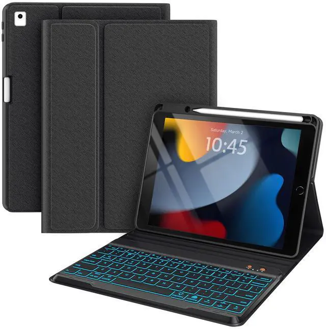 iPad Air 3 10.5" Keyboard, Case with Pencil Holder for iPad 10.5", Smart Folio Keyboard for iPad 7th/8th Gen 10.2", Tablet Keyboard Cover(Black) PRODUCTS ADVANTAGE & FEATURES Wireless detachable keyboard connectivity within 10 feet, makes typing on the iPad as a laptop PU leather case and precise cut-out protects iPad from drops and falls Anti-slip groove design provides multiple viewing angles Built-in pencil holder provide a place nicely secure your stylus pen Scissor key structure provides soft and smooth typing experience Auto sleep/wake Function saves a lot of life for your iPad COMPATIBLE DEVICE *Only fit for ipad 8th Gen 10.2'' 2020-Model NO. A2270/A2428/A2429 * Only fit for iPad 7th Gen 10.2'' 2019 -Model NO. A2197/A2198/A2200 *Only fit for iPad Air 3 10.5'' 2019 -Model NO.A2152/A2123/A2153* Only fit for Pad Pro 10.5 inch 2017 released -Model A1701/A1709 HOW TO CONNECT THE BACKLIT KEYBOARD * Open the cover, turn ON the keyboard * Turn on the Bluetooth of your iPad 10.2 inch 2019 Released * Click "Connect" keys to open the Bluetooth of the keyboard * Go to your iPad bluetooth setting, click on bluetooth and look for Bluetooth Keyboard" in the searching page, just select it NOTE 1. Please charge your keyboard for 2~3 hours the first time you use 2. Turn on the keyboard, the power indicator will flash about 3 seconds then goes off 3. When use it for the second time: only need to turn on your tablet Bluetooth and keyboard power, press any key on the keyboard. Then it will automatically connect (No need to click"BT keyboard" on the iPad screen, also don't press "CONNECT" button on the keyboard , otherwise, it will show Not Connection) PACKAGE CONTENT 1 * Wireless Keyboard Case (No Stylus Pencil or mouse mad) 1 * Micro USB Charge Cable (No charger) 1 * User Manual