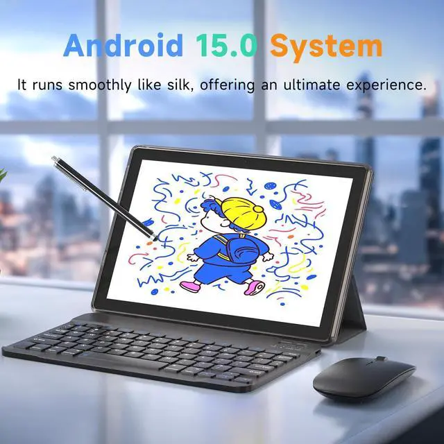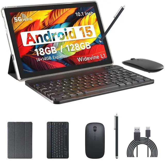 2025 Android 15 Tablet, 10.1 Inch 18GB ( 4GB Physical RAM + 14GB Expanded Virtual RAM) RAM+128GB ROM/ 2TB Expandable Tablet PC, 2 in 1 Tablets with Keyboard/ Mouse/ Case/ Stylus, 2.4G/5G Wifi 6 BT 5.0, 2.0Ghz Quad-core Processor Computer Tablet, 1280*800 IPS 10'' HD Touch Screen, 2+8MP Dual Camera, 6000mAh Battery.