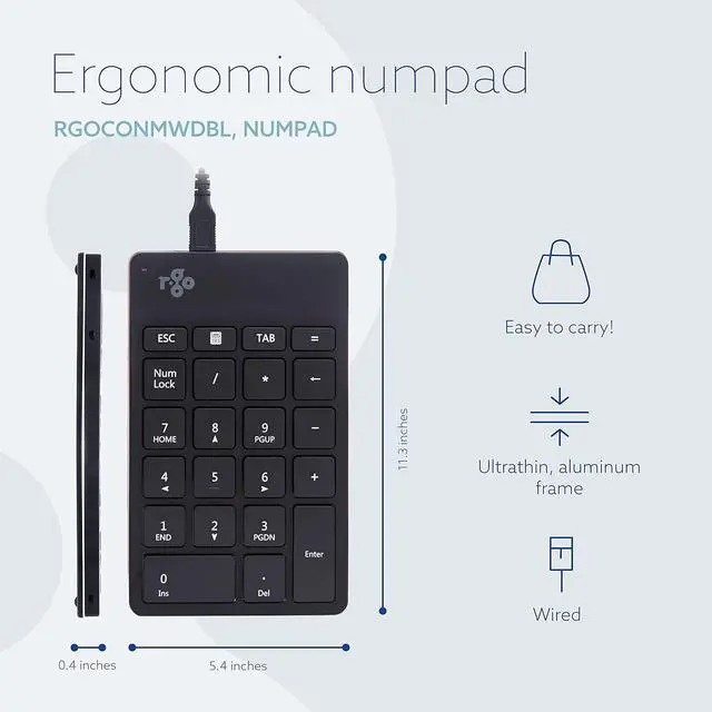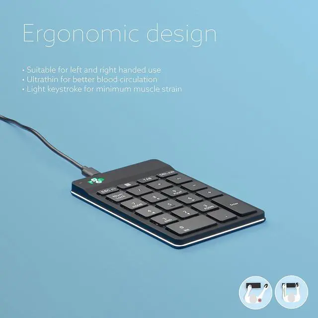 Ergonomic design: The ultra-thin design of this numeric keypad allows your wrist to have a natural flat position while typing. This allows you to type without pinching blood vessels and tendons