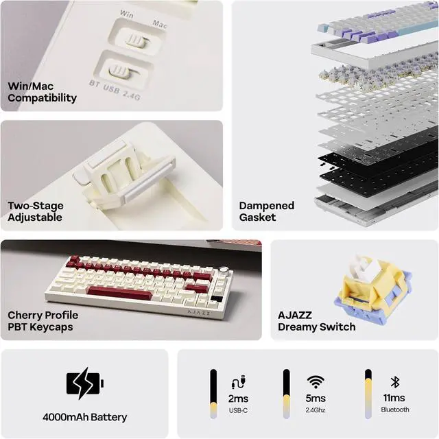 Hot-Swappable & Ergonomic: Say goodbye to wrist strain and finger fatigue, with this Cherry-profile keyboard be your ultra-comfort assistant for browsing the digital world. With a 2-stage adjustable kickstand offering 3 typing angles, AK820 PRO can be as high or low as your needs or comfort calls for. The Gasket structure gives AK820 PRO extra flexibility for soft and soothing typing, without harsh bottom-out after each keypress, while the hot-swappable plate enables you to experiment typing feel and sound easily, with compatibility with 3/5-pin mechanical switches of linear, tactile or clicky nature.