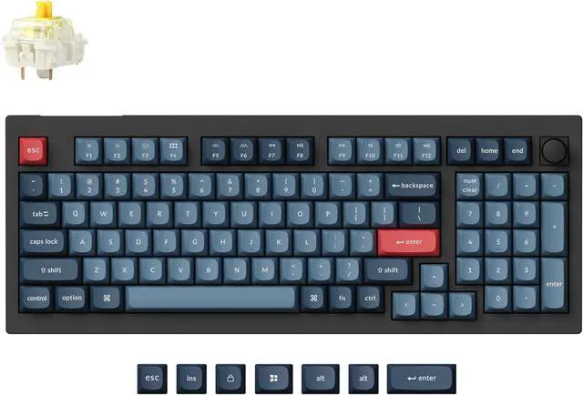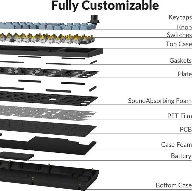 The V5 Max is a compact 96% Layout QMK/VIA wireless mechanical keyboard upgraded with a 2.4 GHz wireless connection, featuring a 1000 Hz polling rate (on both 2.4G and wired modes). Its gasket mount design, sound absorbing foam, double-shot PBT keycaps, and more take your typing experience to a new level, delivering heightened levels of comfort and productivity.