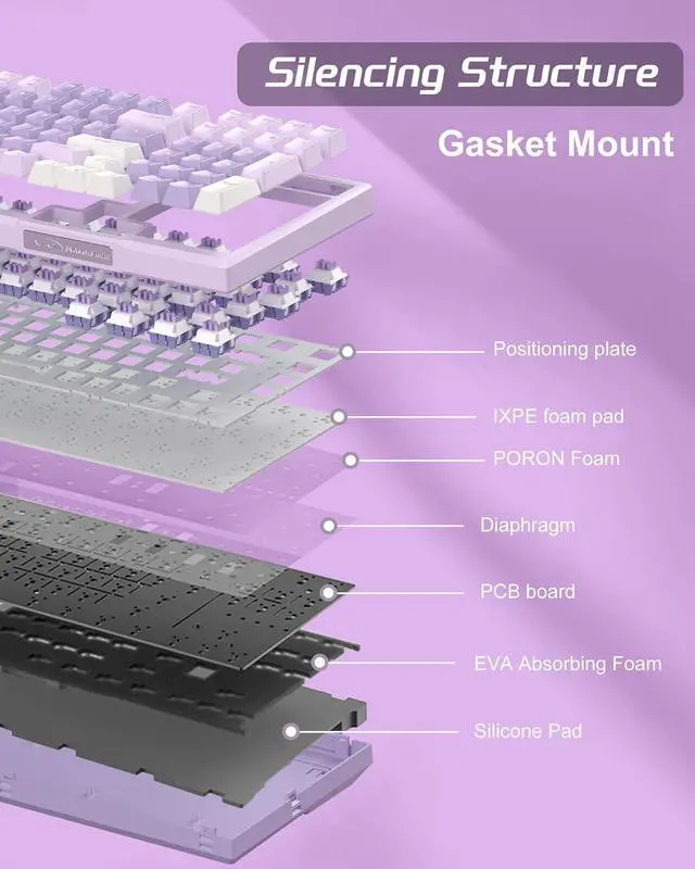 5-LAYER SOUND ABSORBING FILLING: In order to improve the noise situation, this gasket keyboard is equipped with a IXPE foam pad, PORON foam, diaphragm, EVA soundproofing foam and silicone absorbing pad in the gaps between the positioning plate, PCB board and bottom. This reduces the resonance space inside the keyboard, thereby suppressing hollow sounds and making every key press comfortable and pleasant. For gamers and office users, this keyboard is a great addition to the desktop.