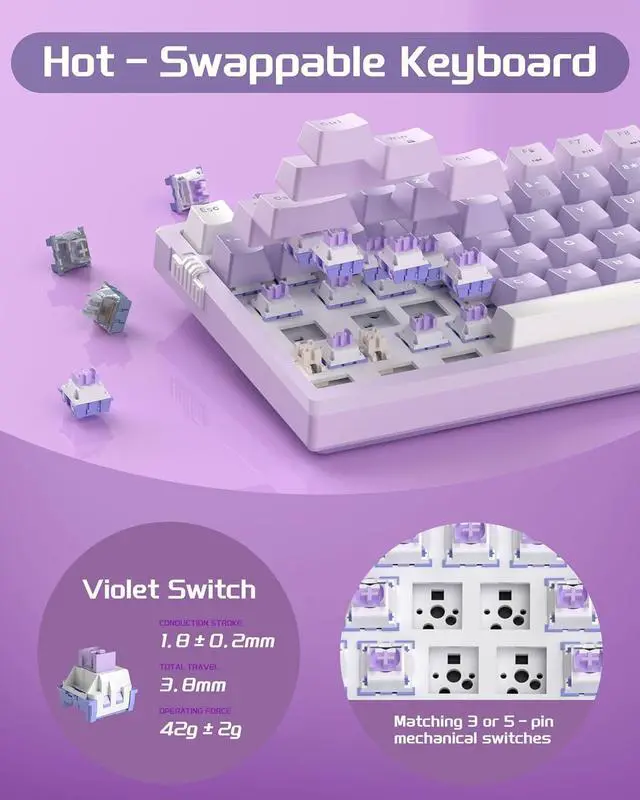 HOT-SWAPPABLE SOCKET & PRE-LUBED CUSTOM SWITCHES: This 96% mechanical keyboard is compatible with 3-pin or 5-pin switches, allowing you to personalize your keyboard. The switches are individually removable and can be replaced in seconds. The SKY98 keyboard utilizes MageGee's finely tuned switches, which are pre-lubricated at the factory and built to last up to 70 million keystrokes for responsive and creamy typing.