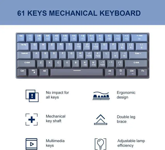 Solid Sea Blue Color Backlit And 19 Mode BacklightMageGee 61 keys mechanical gaming keyboard key light has 19 backlight operation modes (Fn2+|(Light Switching); The light can also be turned off if you dont need lighting. Advanced anti-ghosting technology allows all 61 keys to work simultaneously to provide a fast typing response. The keyboard supports plug & play without any software