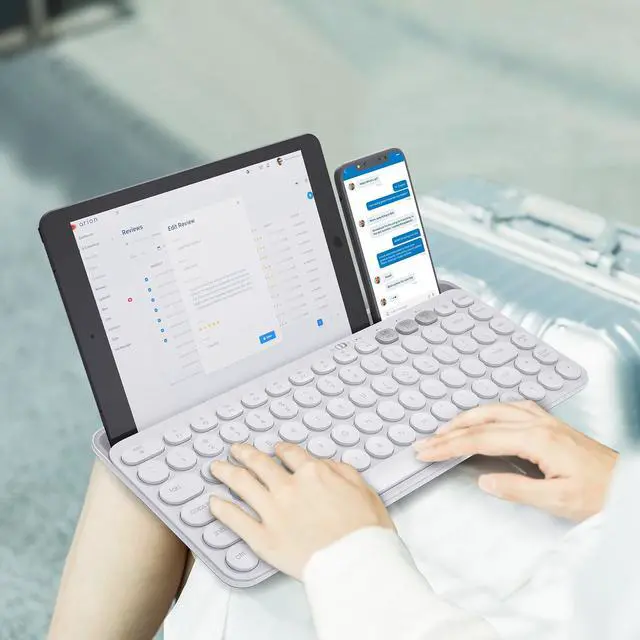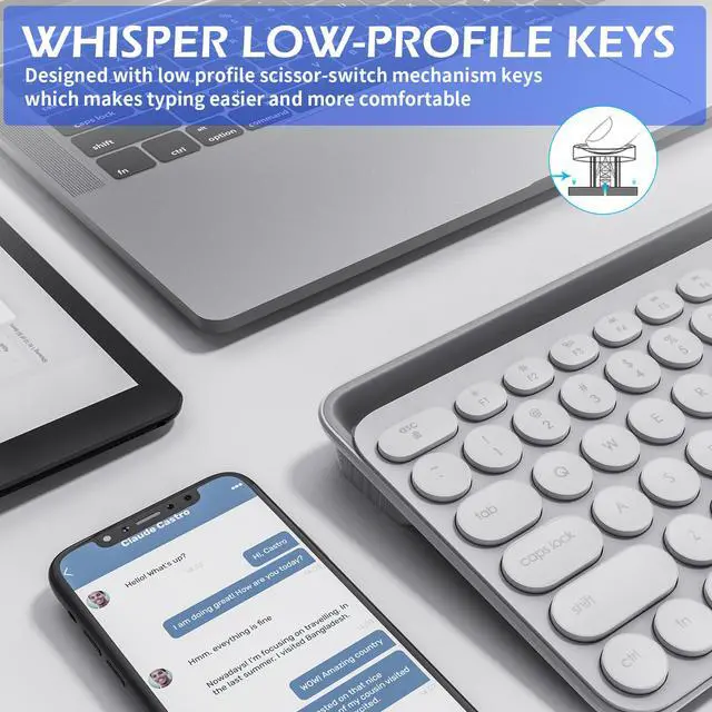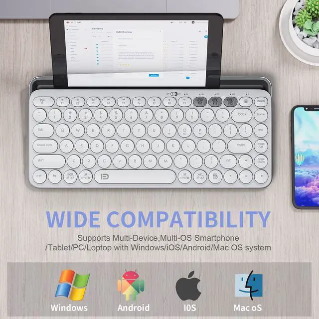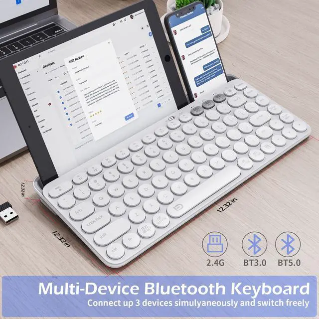 This keyboard has 3 options which can connect your phones, tablet, laptop or computer simultaneously and easy switch between them by pressing 2.4G/BT1/BT2, perfect for those needing to handle multiple devices.