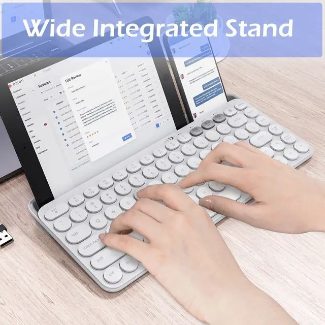 Computer& Smart TV: Dell HP Lenovo computer with Windows 7/8/10 or later Samsung Smart TV, Apple TV 2nd and 3rd generations only Strong Bluetooth Connection and stable 2.4G Connection Bluetooth 3.0 and 5.0 technology provides a cable-free & clutter-free connection, operating distance 15m. 2. G For Desktop PC Laptop without Bluetooth function Built-in Wide Cradle A built-in cradle holder keeps your devices in place and at the optimal viewing angle, so you can read while typing.