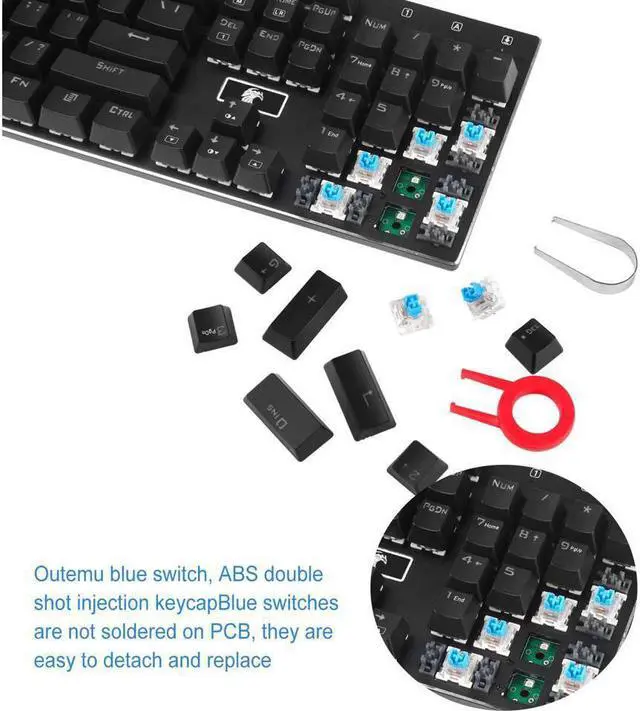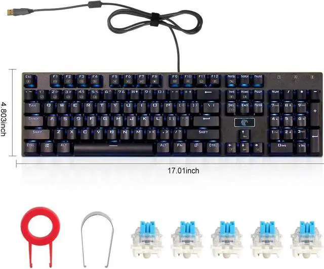 Package Content: 1 mechanical keyboard 1 user guide 1 keycap puller 1 switch puller 5 blue switches to replace if need