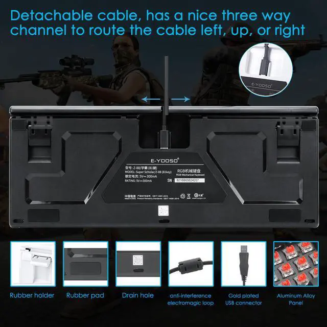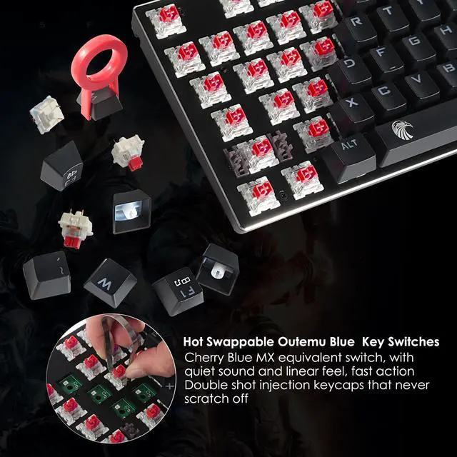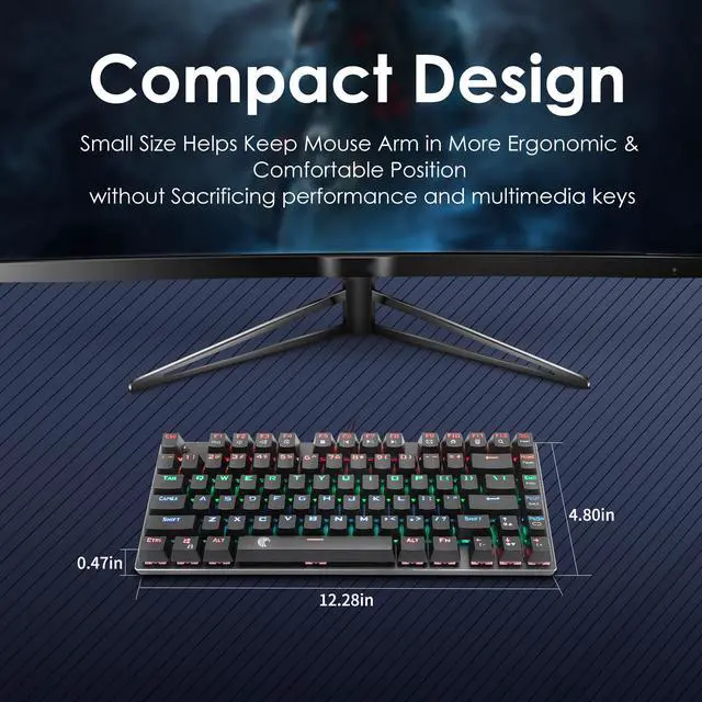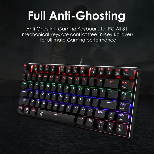 Easy Installation Just plug and play, USB interface, No need driver and software. The including keycap puller is for easy cleaning and maintaining. Compact&Ergonomic Design With 81 keys, it is smaller to save space on your desk and more portable. The stepped keycap makes it sleek to fit your hands easily to prevent fatigue. Provides Windows Key lock for gaming Strong Durability Made of matal and ABS with plate-mounted mechanical keys and switches which can stand the tough industrial /office /gaming application. The keyboard is waterproof and dust-proof. Custom Mechanical Switches Red switches which offer silent click and precise tactile feedback for typing and gaming control each key independently.