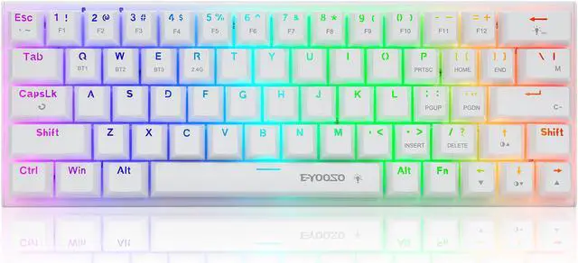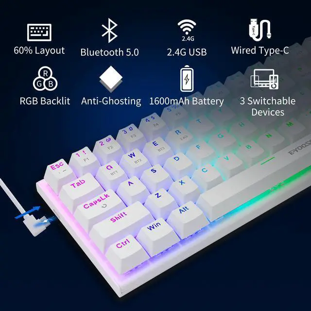 E-YOOSO 60% Mechanical Gaming Keyboard supporting 2.4Ghz USB wireless, Bluetooth 5.0, and Type-C wired 3 modes to connect your device.