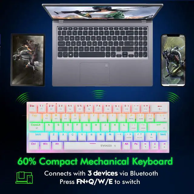 E-YOOSO 60% Bluetooth Mechanical Keyboard can connect 3 devices at the same time by switching the Bluetooth mode.