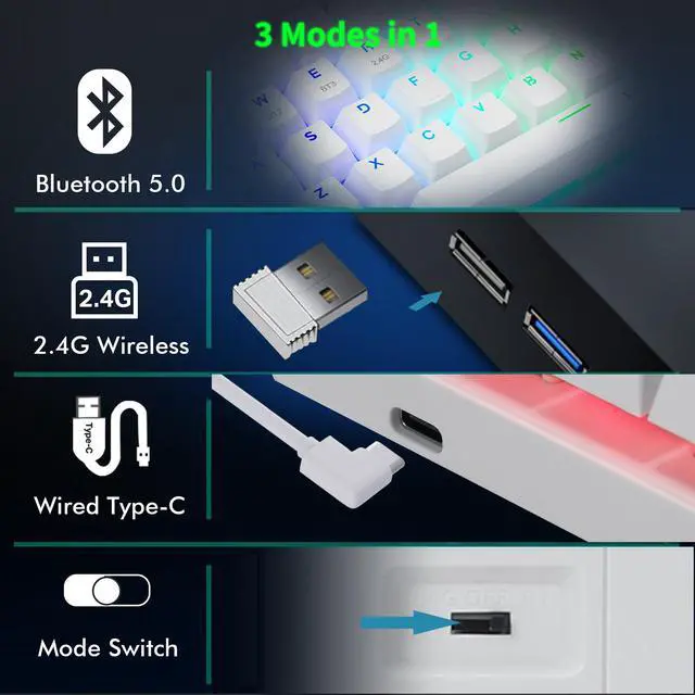 3 Modes Connectivity: The Wireless mechanical keyboard, supporting 2.4Ghz USB wireless, Bluetooth 5.0, and Type-C wired 3 modes to connect your PC, laptop, iPad, phone. And you can connect 3 devices at the same time by switching to the Bluetooth mode.