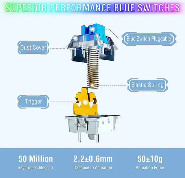 Outemu Pluggable Mechanical Blue Switches Pressing the switch makes a loud click sound, crisp paragraph feeling, excellent tactile feedback, providing precise tactile feedback for typing and gaming.