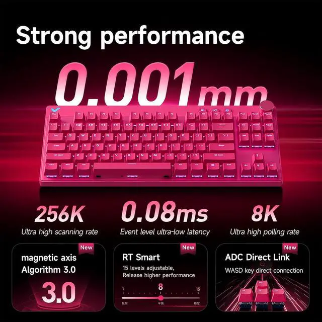 React Instantly & Perform at Your Peak: 256K ultra-high scan rate and 0.08ms competitively low latency. Supports rapid trigger (RT), SOCD (Snap Tap), DKS(Dynamic Keystrokes)/MT/TGL/RS functions, eliminating the limitations of traditional macros. Ultra-high polling rate of 8000 Hz increases accuracy and minimizes keyboard input latency