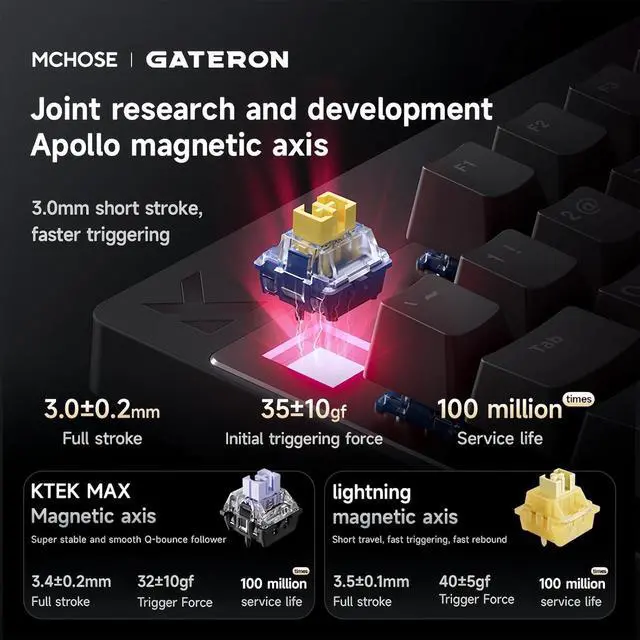 Customize Every Keystroke: Equipped with Hall effect Apollo magnetic Switch for e-sports game, offering ultra-precise 0.001 mm adjustment. Adjustable trigger point from 0.01-3.4 mm gives you control keystrokes, and the key travel is dynamically calibrated with each trigger. Direct connection via WASD keys for a leap in gaming experience