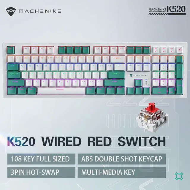 MACHENIKE K520 Wired Mechanical Keyboard 108Key Full Size,RGB Sidelit 20 LED Light Efect,Multi-Media Key,3Pin Hot-Swap - Red Switch