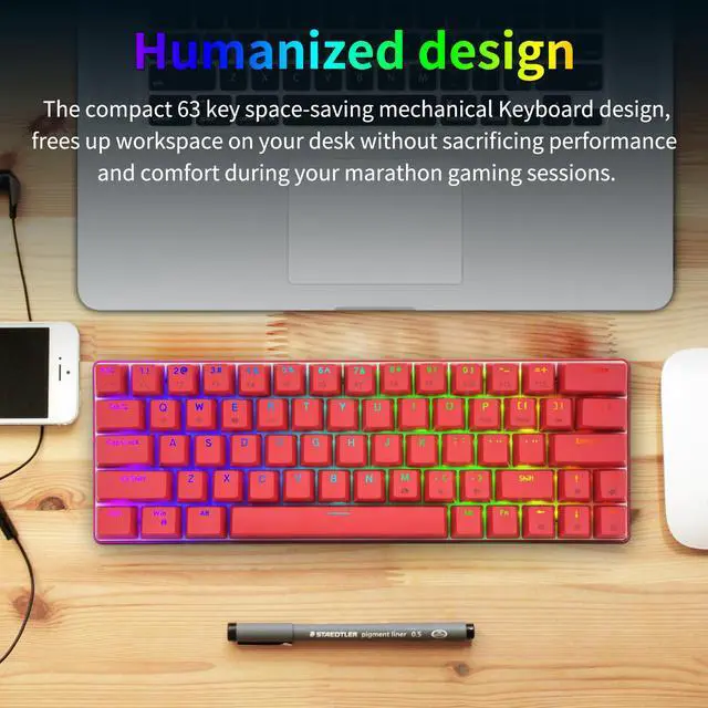 Compact Keyboard CQ63 is a 60% layout (63-key) RGB backlight compact Bluetooth mechanical keyboard that retains shortcut, arrow keys, and comes with dedicated screen capture key. RGB LED Backlit Chroma Dimmable FN+? /: 15 backlight mode, make a beautiful sight on your desk.