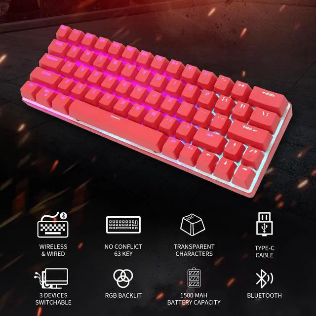 Compact Keyboard CQ63 is a 60% layout (63-key) RGB backlight compact Bluetooth mechanical keyboard that retains shortcut, arrow keys, and comes with dedicated screen capture key. RGB LED Backlit Chroma Dimmable FN+? /: 15 backlight mode, make a beautiful sight on your desk.