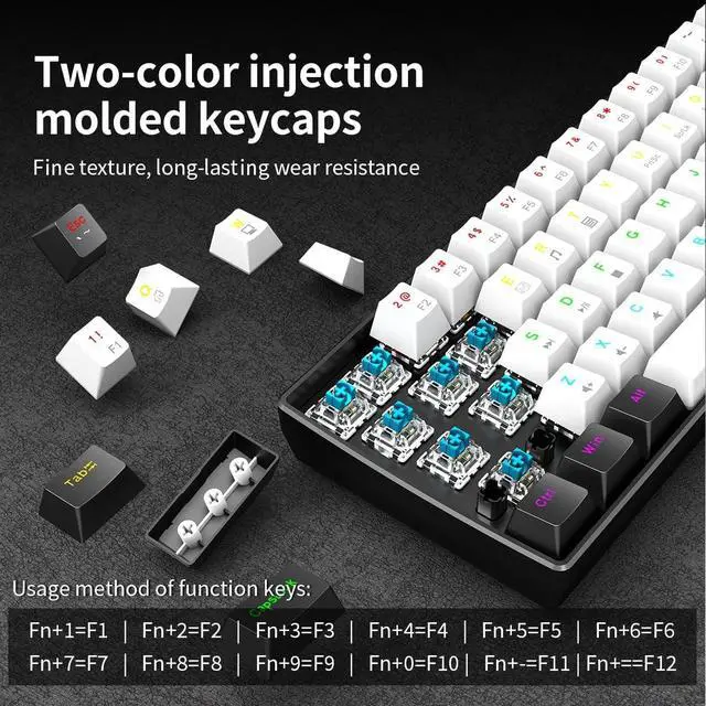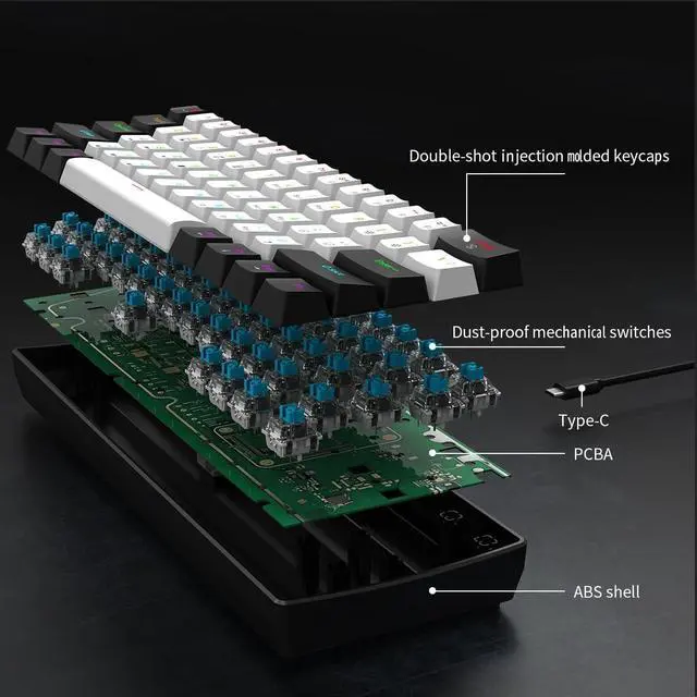 Cool RGB Backlight EffectThe 60% RGB keyboard includes 6 backlight effects and 8 backlight color switching. Different RGB settings enrich your typing time. The lighting speed and level can also be adjusted according to your needs. Now, the key cap is upgraded to two-color injection molding, and the figure is transparent and glow.