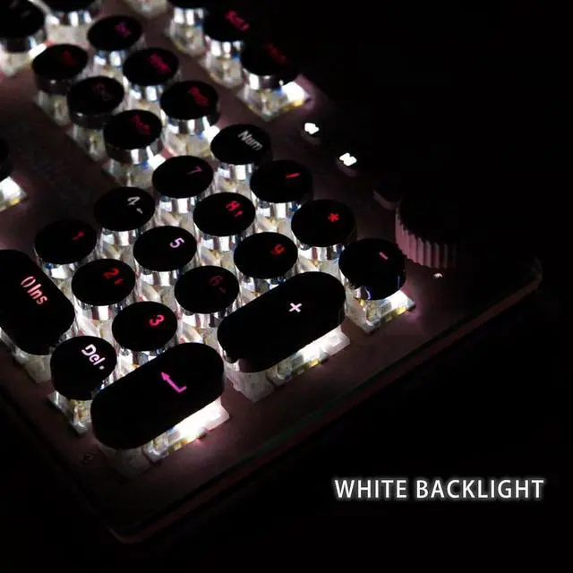 Mechanical Blue Switch Gaming Keyboard - Mechanical Blue Switch Gaming Keyboard (Cherry Blue Equivalent) for ultimate gaming performance. Retro keycap looks like a classical typewriter, brings you comfortable typing feeling & stable clicking touch. The Mechanical Keyboard Keys offer medium resistance, audible Click Sound & Tactile Feedback. Sensitive and Responsive. Easy to press and fast response.
