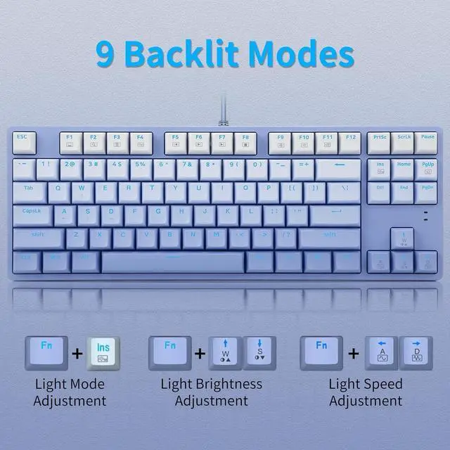 Charming LED Backlit Customizable multiple illuminated light effects with static and dynamic, supports 19 kinds backlight modes, press Fn + Ins to switch , FN + / control backlight brightness, FN + / control backlight speed.