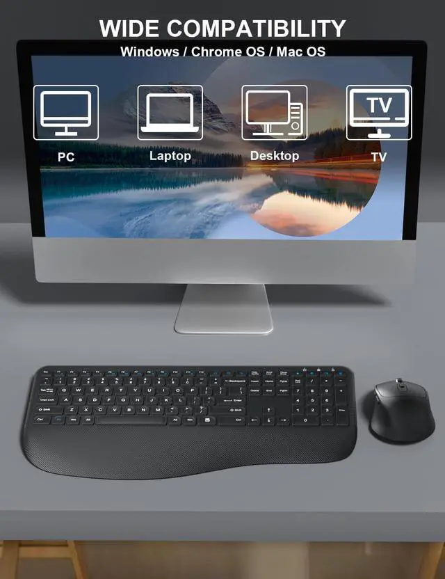 COMFORTABLE WRIST REST Ergonomic keyboard designed with a generous palm rest and adjustable tilt feet, offers a better typing position to reduce the pressure on your wrist. The wireless mouse provides total comfort with a perfect handshake angle, contoured grips and premium matte finish.