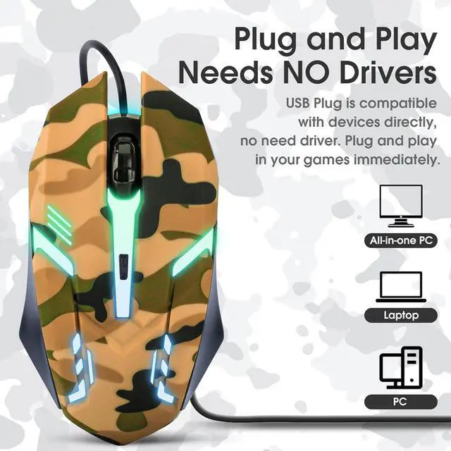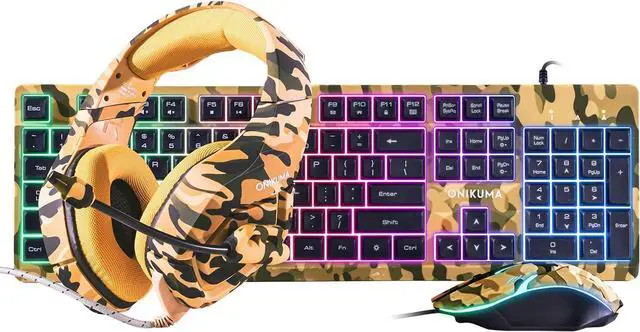 COOL APPEARANCEGaming keyboard and mouse both have colorful backlight: 104 keys keyboard has rainbow color backlight; gaming mouse's has 7 color LED breathing light. The wired gaming keyboard and mouse and headset has a cool camouflage coating, which is tactile and advanced and allows you to immerse yourself in the game.