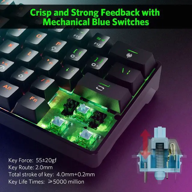 Classic Mechanical Typing - Equipped with high-quality blue equivalent switches, 50 million keystrokes lifespan, 2.0mm distance to actuation, 55±20gf key force, more stable and accurate to the output of your ideas, delivering more immersive gaming experience with strong Clicky BGM.
