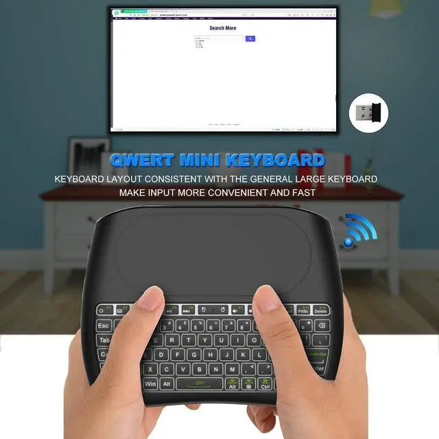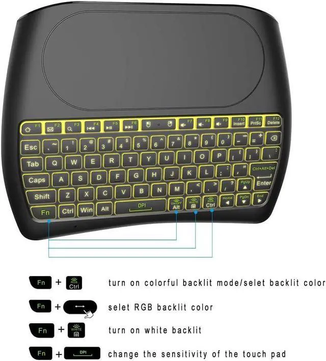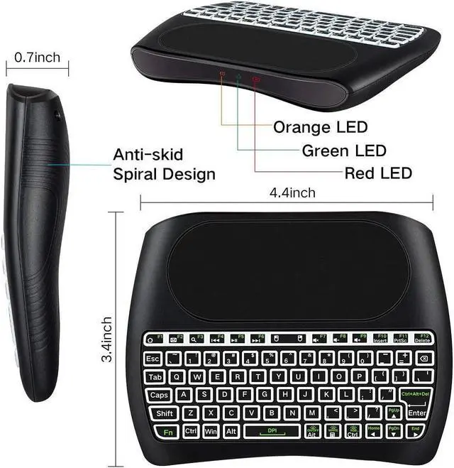Game Handle Design Colorful backlit mini wireless keyboard hand-tilt design and spiral-patterned anti-slip design on the back helps you play conveniently and your hands no longer tired, large track-shaped touchpad makes you click /duouble click easily, cool mirror signal light shows a sense of technology.