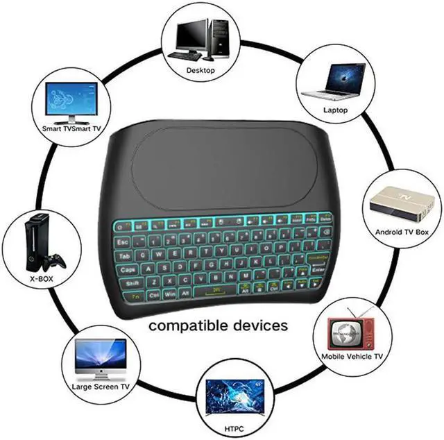 Colorful backlit Integrated backlit wireless mini keyboard with adjustable 3 levels of brightness and 7 backlight colors to be used in dark nights.