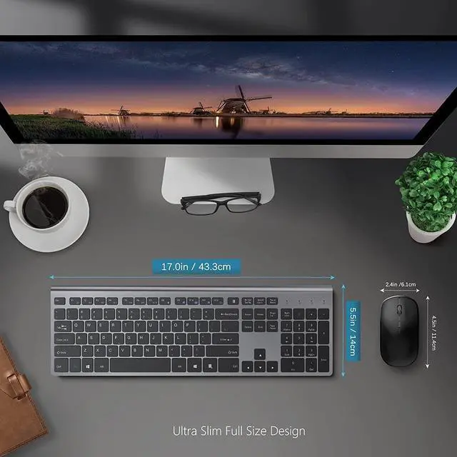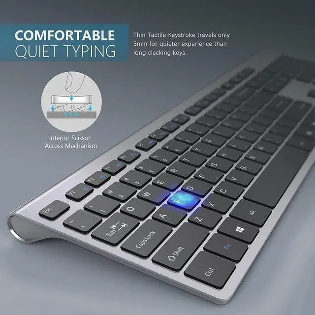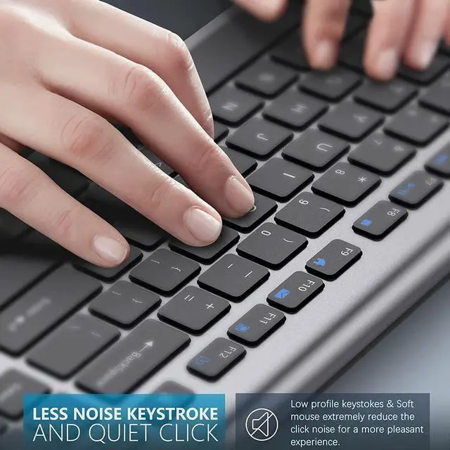 LESS NOISY ERGONOMIC DESIGN-The wireless Keyboard: the scissor across mechanism keystroke makes typing comfortable, light responsive and the raising angles supports your hand for long time work. The silent mouse has soft click so no "click" disturb your surroundings any more!