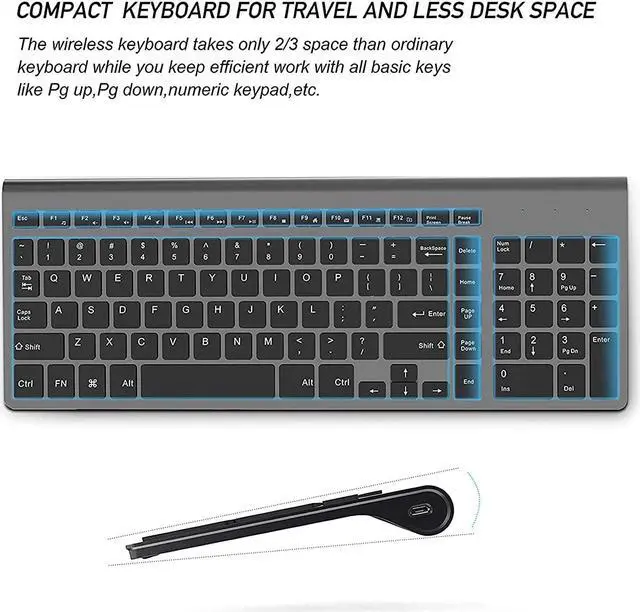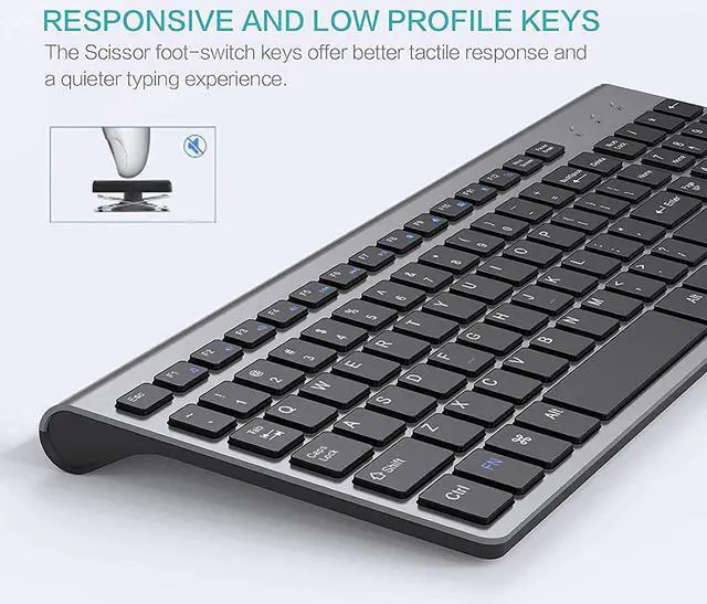 QUIET and COMPACT DESIGN-JOYACCESS wireless desktop keyboard has all keys in scissor-cross low profile structure; which maks it ulra-slim (keystroke travel 2mm), resposive and less noise. The portable mouse is also built-in newest noise-free switches for quiet click. Both keyboard and mouse give a world of silence and a morden desktop; great for conference, board presentation, library, coffee shop, night work, travel, etc.