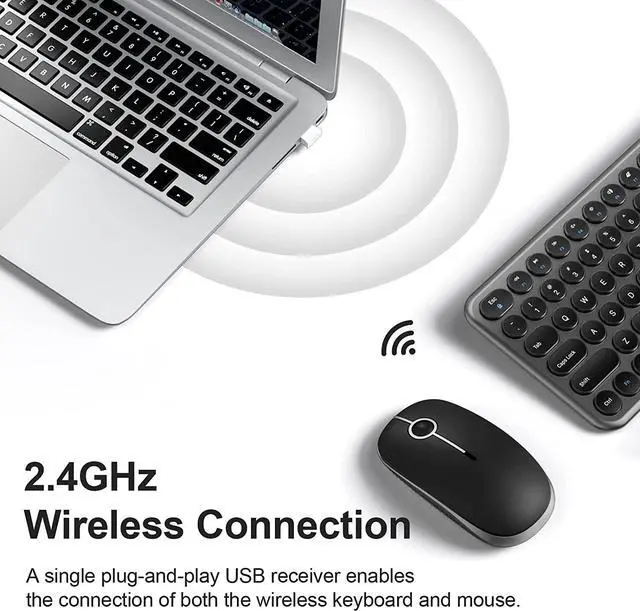 PLUG and PLAY 2.4G WIRELESS KEYBOARD MOUSE: Simply insert the ONLY ONE nano USB receiver (stored inside keyboard, NOT inside the mouse) into your computer and use the keyboard and mouse instantly. 1 usb Receiver Can Connect Both Keyboard and Mouse.