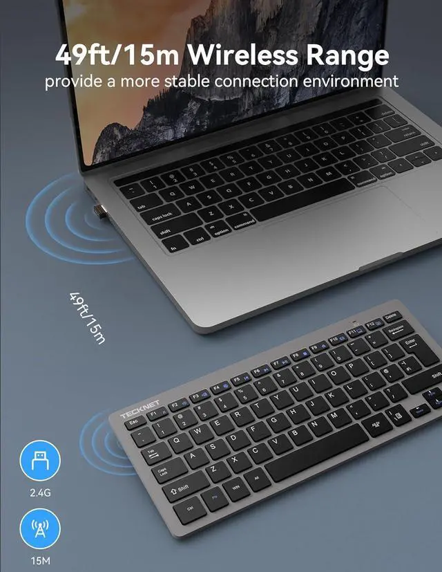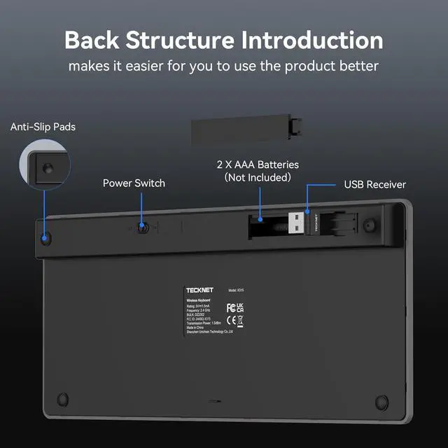 Plug-and-PlaySimply insert the nano USB receiver into your computer and enjoy a reliable 2.4G wireless connection with an impressive range of up to 49ft / 15M. (NOTE: USB receiver stored in battery compartment on back of mini keyboard. )