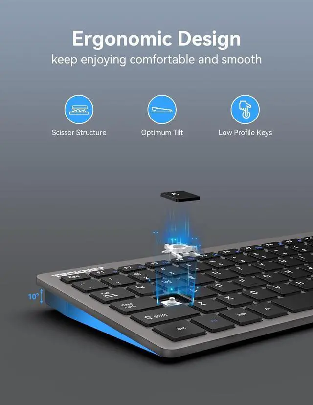 Quiet Typing & Ergonomic DesignThe Scissors X structure of this small keyboard ensures a comfortable typing experience, while the low-profile keys provide quiet and enjoyable typing.