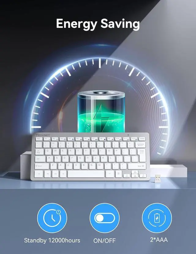 Long Battery LifeExperience the convenience of a long-lasting battery with this mini wireless keyboard featuring an auto-sleep design. Enjoy up to 12 months of usage based on 2 hours of daily use. (NOTE: batteries not included)