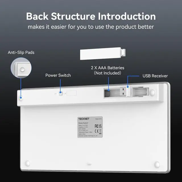 Plug-and-PlaySimply insert the nano USB receiver into your computer and enjoy a reliable 2.4G wireless connection with an impressive range of up to 49ft / 15M. (NOTE: USB receiver stored in battery compartment on back of mini keyboard. )
