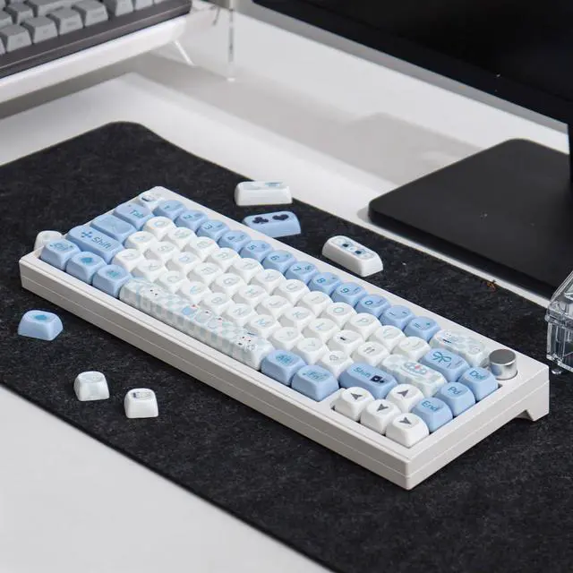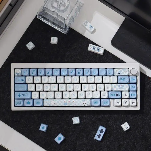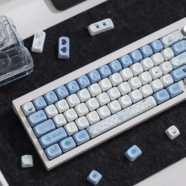 Dye Sublimation PBT KeycapsThese blue white rabbit keycaps are made of high quality thick PBT material and an anti-grease coating, sturdy and durable, it is no shiny grime buildup with continuous use. Compared with ABS material, PBT keycaps have better wear resistance and oil resistance. Dye-sublimation technology allows the color to penetrate into the keycaps, and the fonts on the keycaps are clear and not easy to fade.