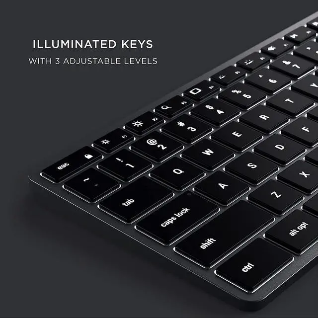 Illuminated Keys - features backlit keys with three levels of brightness to adjust to the perfect lightning in any environment and function hot keys to easily adjust brightness, volume, search, pause, play, and more, at your fingertips