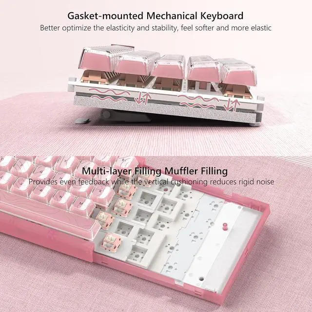 Hot Swappable & POM Linear Switches: VK66 PRO keyboard is equipped with hot-swappable PCB to ensure easy replacement of different mechanical switches with 3-pin and 5-pin. The Hot-Swappable custom keyboard adopts POM material pre-lubed mechanical switches with 80 million keystroke lifespan. Creamy and thocky sounding gives you unlimited fun while typing.