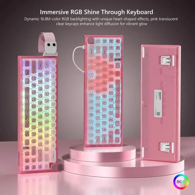Topographic Pink Creamy Keyboard & Keyboard StrapImmersive RGB lighting experience, WOMIER VK66 PRO keyboard features dynamic 16.8M-color RGB backlighting with unique heart-shaped effects, controllable via VIA open-source software. The pink translucent clear keycaps enhance light diffusion for vibrant glow. The popular keyboard strap can be installed or disassembled according to your preference.