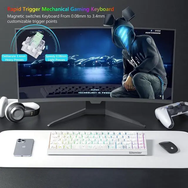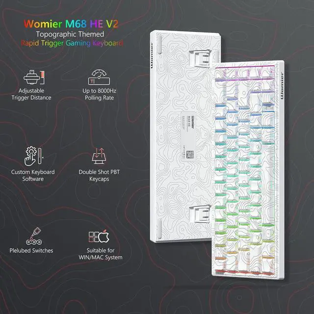 Hall Effect Mechanical Gaming KeyboardThe keyboard is equipped with womier custom hall effect magnetic switches, offering ultra-accurate typing experiences adjustable in 0.1mm. From 0.08mm to 3.4mm customizable trigger points, each key can be personalized according to the minimum unit of 0.1mm. In addition, the press sensitive and reset sensitive can be set individually through the software to match the key press habits of different people for different types of games.
