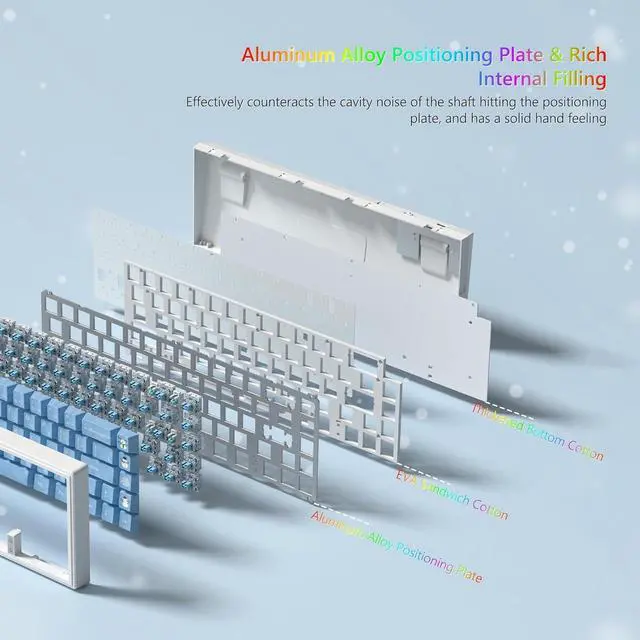 Snow and Ice Themed Custom Keyboard67key compact layout keyboard with topographic pattern on both shell and keycaps. Metal PCB plate, Make the keyboard stable and feel better, can stabilize the performance of the magnetic switches. Double layers of sound-absorbing cotton and ergonomic two-stage foot design improve the stability of the keyboard while delivering a better gaming experience.