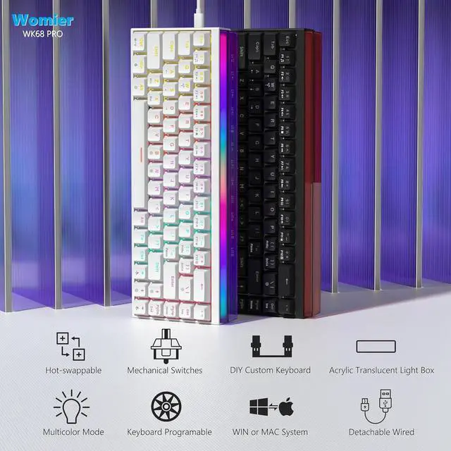 WK68 PRO RGB Light Box 60% Percent Keyboard: Womier brings you the latest popular keyboard. The keyboard is filled with RGB mixed-color lights, and the translucent light box can adjust RGB and monochromatic lights, which doubles the playability of the keyboard. Compact layout, not occupying desktop space. Give you the infinite possibility of DIY.
