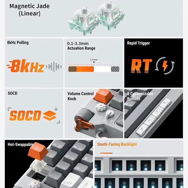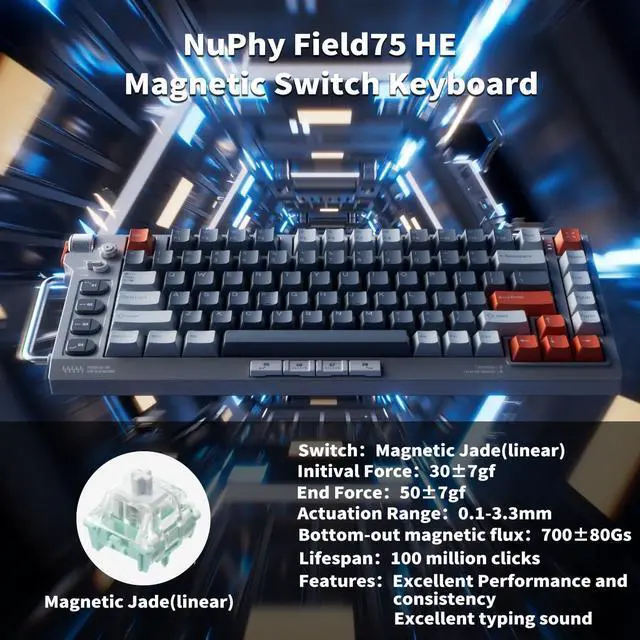 Magnetic Switch - Field75 HE utilizes magnetic switches and Hall Effect Sensors for faster response, Rapid Trigger; 8000Khz Polling for a better gaming and office experience; Field75 HE also with RGB backlighting, RGB backlighting brings you a better visual experience in the darkness